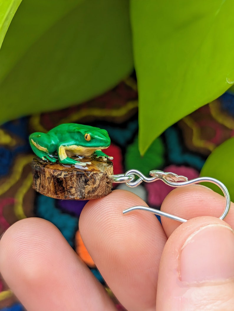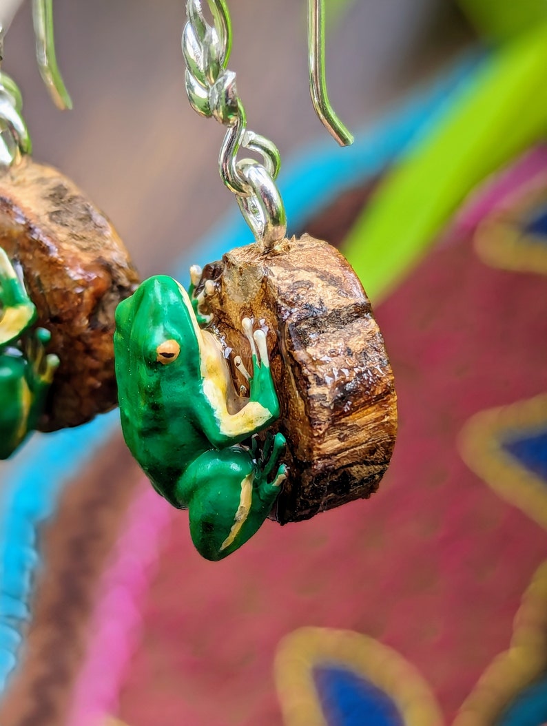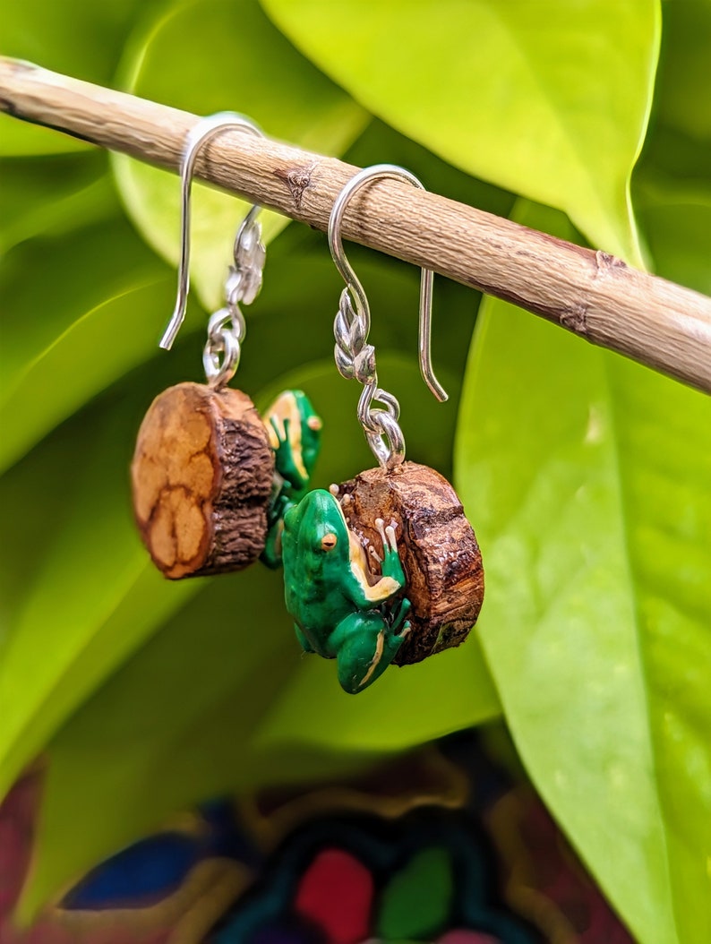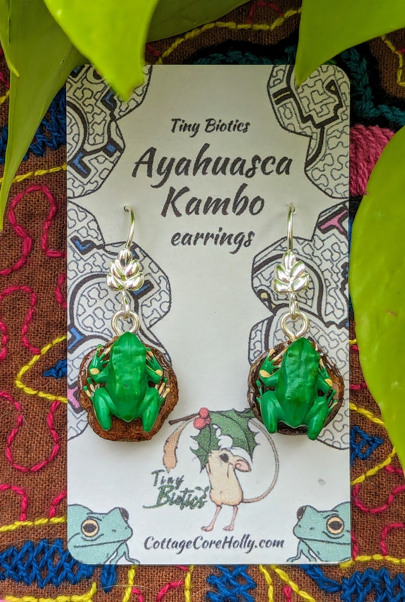 These powerful, one-of-a-kind earrings feature authentic banisteriopsis caapi vine (ayahuasca) hand-rubbed with agua de florida and encased in protective resin, topped with a meticulously handcrafted and hand-painted 3D printed rainforest frog.